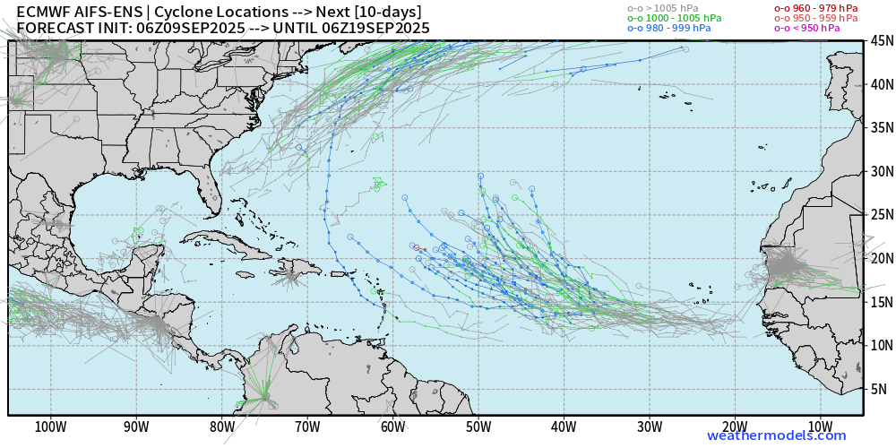 By early next week, models do show the possibility of gradual development with a tropical wave moving west into the eastern Atlantic from Africa. The AI camp of models, including the European AI/Integrated Forecasting System (AIFS) and Google DeepMind, are keener on development than the conventional physics-based forecast models like the European and American GFS.