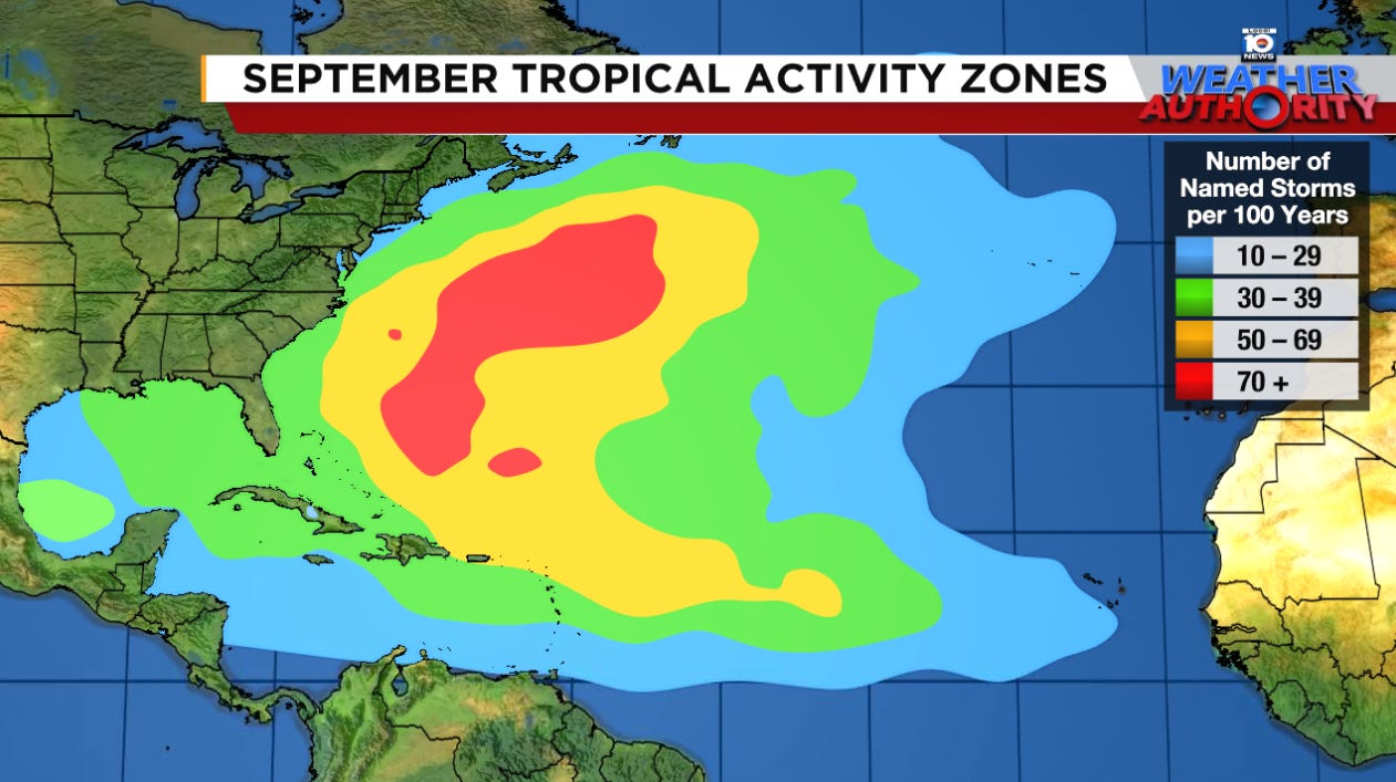 Atlantic hurricane season activity traditionally peaks on or around September 10th, the date around which you’re most likely to find an active named storm. In the modern recordbooks (since 1966) only the 1968 and 1992 hurricane seasons went the two-week stretch leading into the peak without any active named storms in the Atlantic.