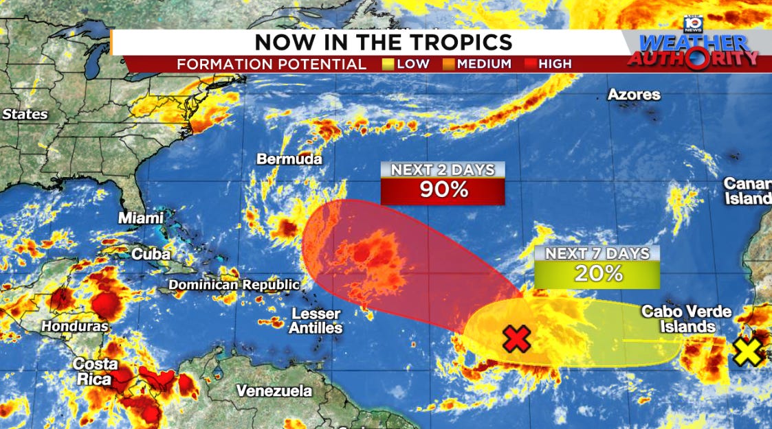 The leading disturbance that we’ve been tracking – a tropical wave designated Invest 92L by the National Hurricane Center – is on track to become a tropical depression or named storm in the coming days while a second tropical wave exiting Africa today could develop by the weekend or early next week.
