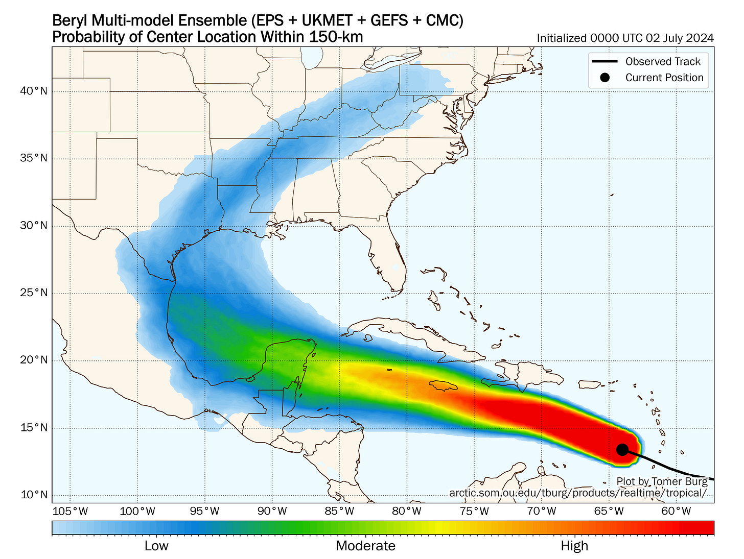 Beryl’s strength at the time will affect its eventual track, with a stronger system moving farther north and a weaker system continuing farther west.