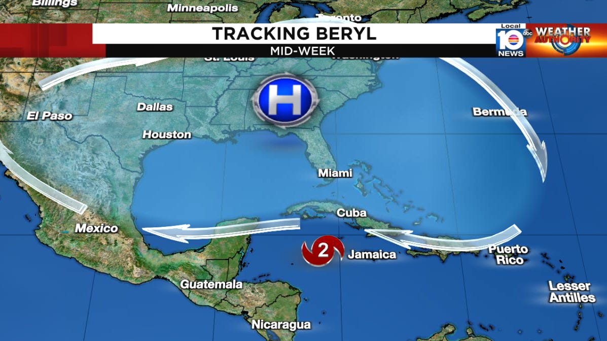 The ridge will quickly rebuild, bending Beryl back to the west on a track toward the Yucatan Peninsula and Gulf of Mexico for the weekend.