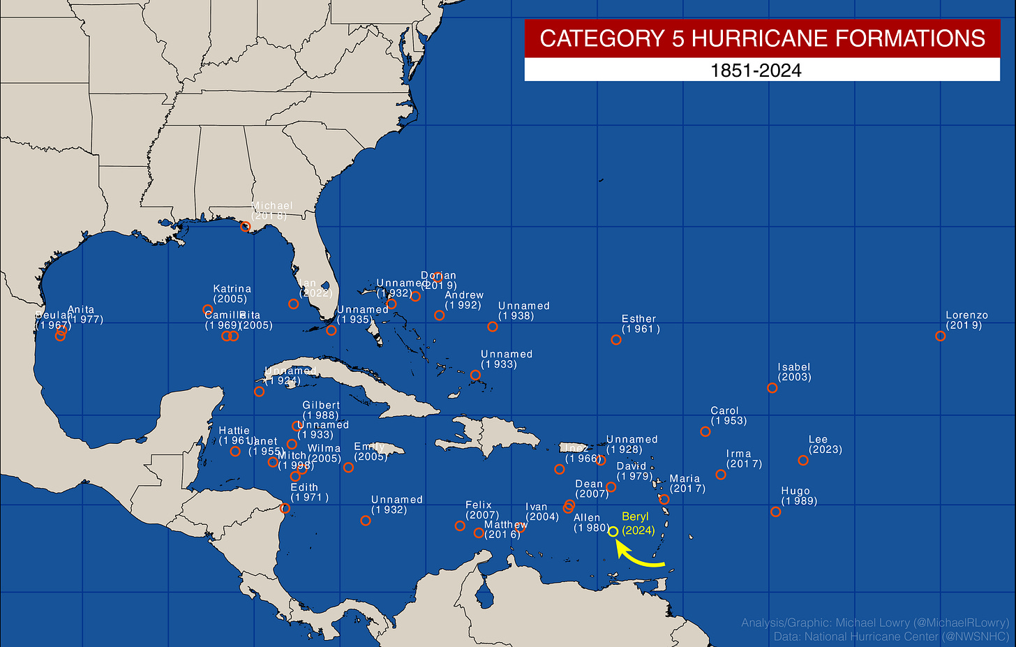 Hurricane Beryl is the 41st Category 5 hurricane on record in the Atlantic and easily the earliest Category 5 hurricane since records began in 1851, forming an astounding 15 days ahead of the previous earliest Category 5 recordholder, Hurricane Emily, which became a Category 5 on July 17th, 2005. Beryl and Emily are the only two Category 5 hurricanes to be observed before the month of August in the Atlantic. Beryl is also now the strongest July hurricane on record.