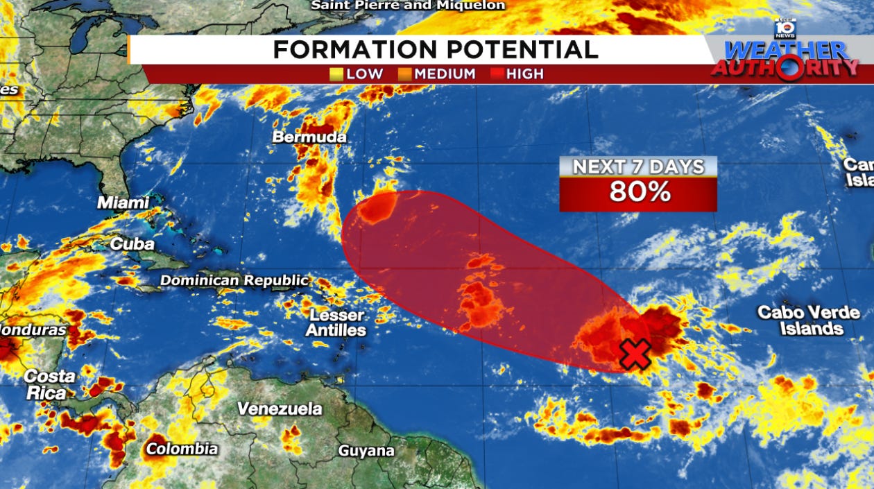 While we don’t see any big contenders on the map yet, models are hinting at some gradual development with a tropical wave expected to exit the African coast in the next few days. Development odds this week will be low but it’s something we’ll monitor for the islands.