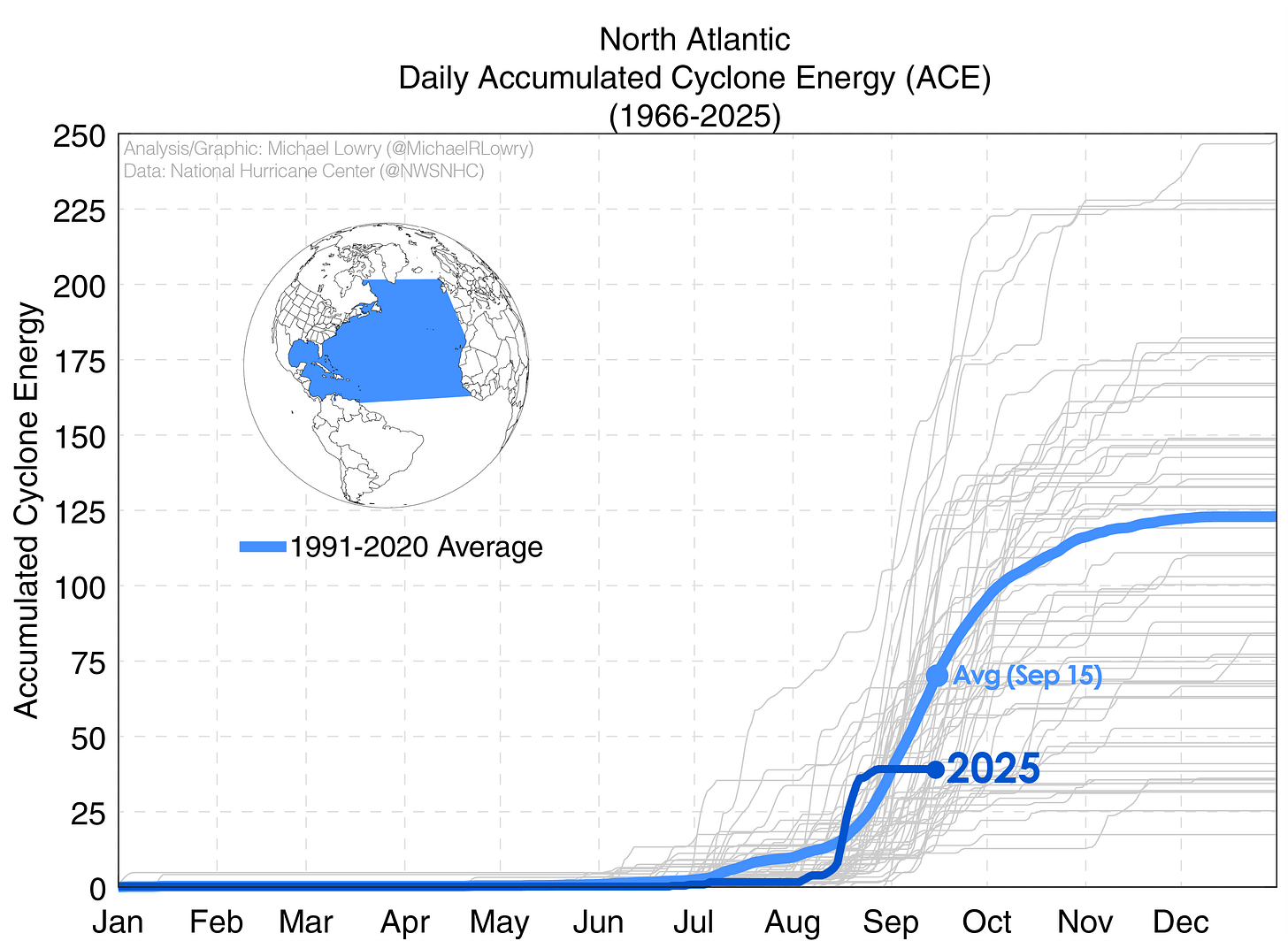 Although the hurricane season comes in fits and starts, with this extended lull at the peak, the 2025 hurricane season is quickly running a deficit and as of today overall activity is almost 50% below average.