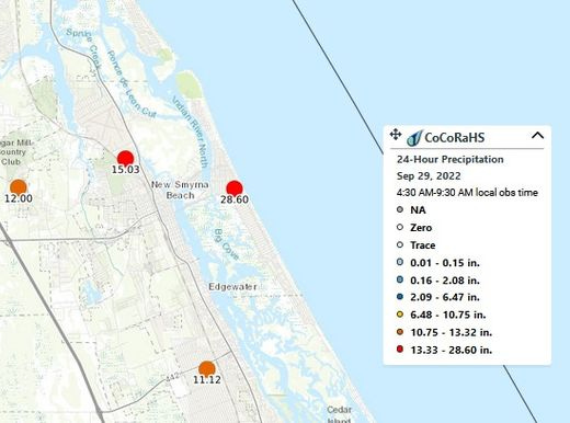 Radar estimates show a long but narrow swath of 15-20 inches focused south of I-4, with recent heavy rainfall from Cape Canaveral to St. Augustine, focused on Daytona Beach. An unofficial report at a volunteer station of over 28 inches was reported at New Smyrna Beach this morning.