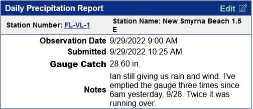 Over the past 12 hours, Ian moved farther east and faster than originally forecast, with its center emerging back over water just north of the Space Coast and Cape Canaveral. It continues to pummel northeast and east-central Florida with back bands of heavy rain, strong winds, flooding storm surge, and destructive waves. Orlando smashed a 24-hour rainfall record ending this morning that alone nearly doubled their average rainfall for September.