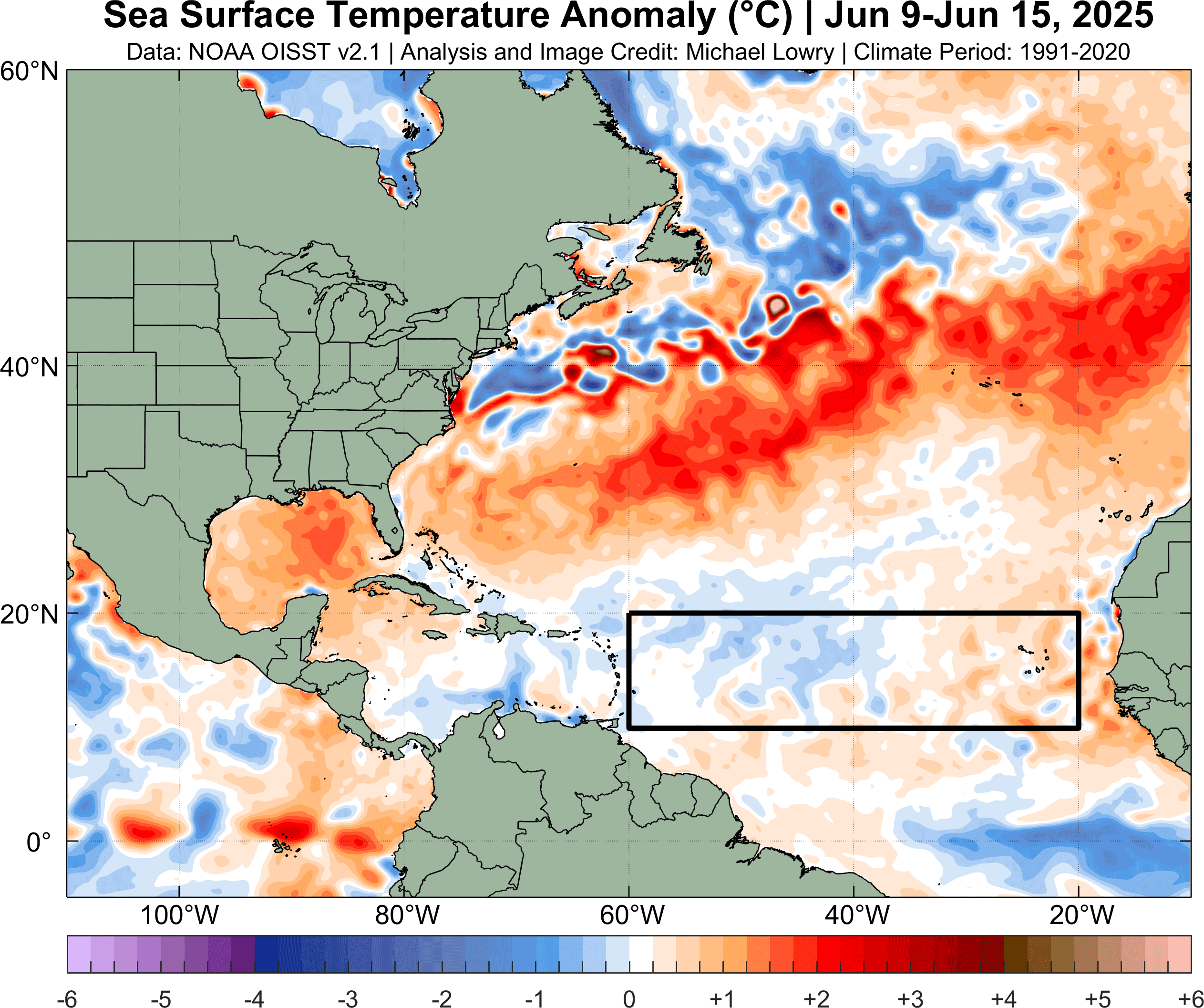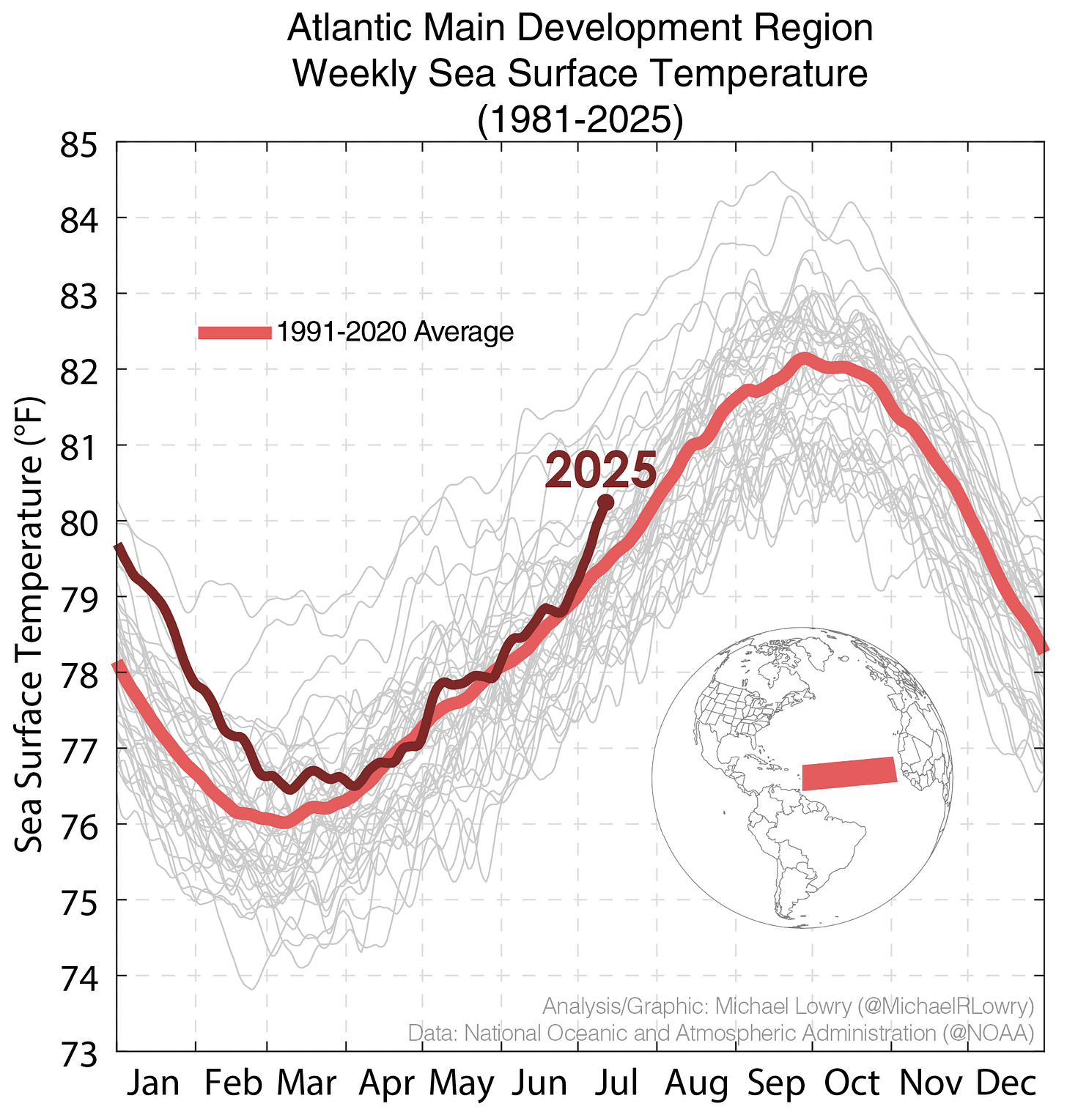 It’s worth noting the warmth across the subtropics (particularly in the band from around 30°N to 40°N east of the U.S.) isn’t a pattern that typically promotes rising air and storminess in the tropical belt, but a warmer MDR would – all else equal – counteract its influence.