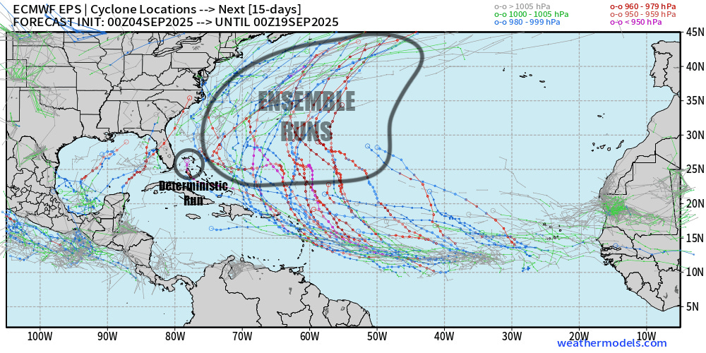 It isn’t that they can’t happen (even a broke clock is right twice a day!), but they’re usually extreme outliers when compared to their more credible ensembles. Both the 360-hour (15-day) so-called deterministic run (single track or operational run) of the American GFS and European models from overnight are good examples of this. They both depict a major hurricane near or along the southeast U.S., but virtually none of their ensemble members show this.