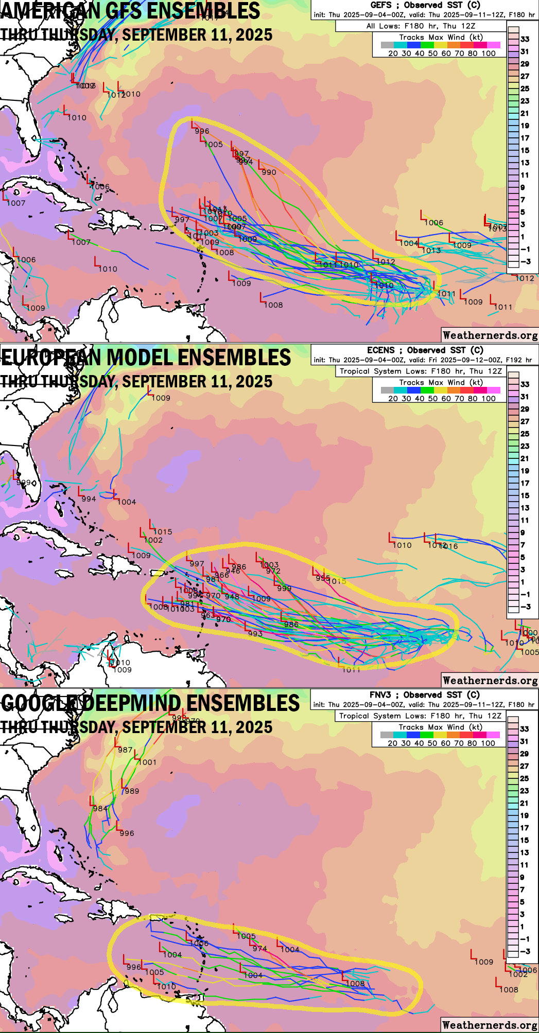 The model camps have held steady in their general trajectories. The American GFS favors a track just north of the eastern Caribbean, the European model is advertising a path into the Lesser Antilles and Leeward Islands, and Google’s machine learning-based DeepMind model remains on the southern side of the guidance, suggesting a path directly into the eastern Caribbean by late next week.