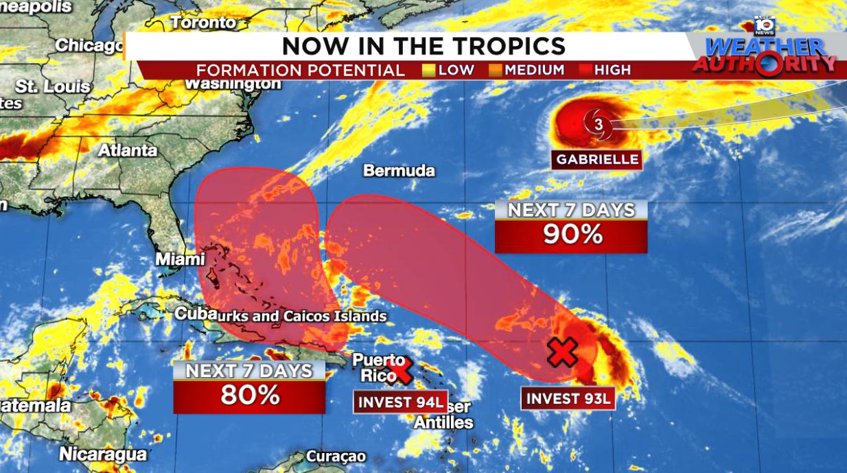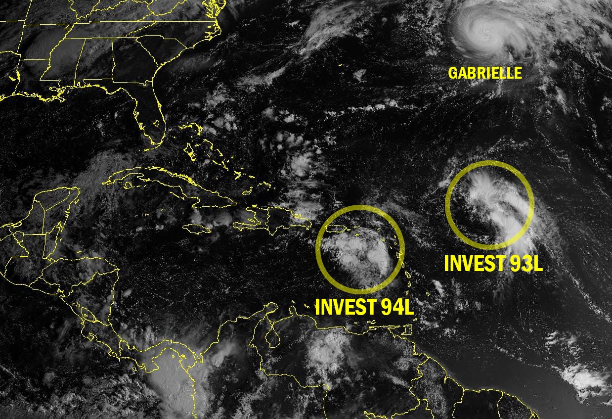 Two vigorous tropical disturbances – designated Invest 93L (easternmost disturbance) and Invest 94L (westernmost disturbance) – are likely to develop in the coming days and could bring impacts to land, with the westernmost system tracking through the Bahamas and near Florida, Georgia, and the Carolinas for early next week.