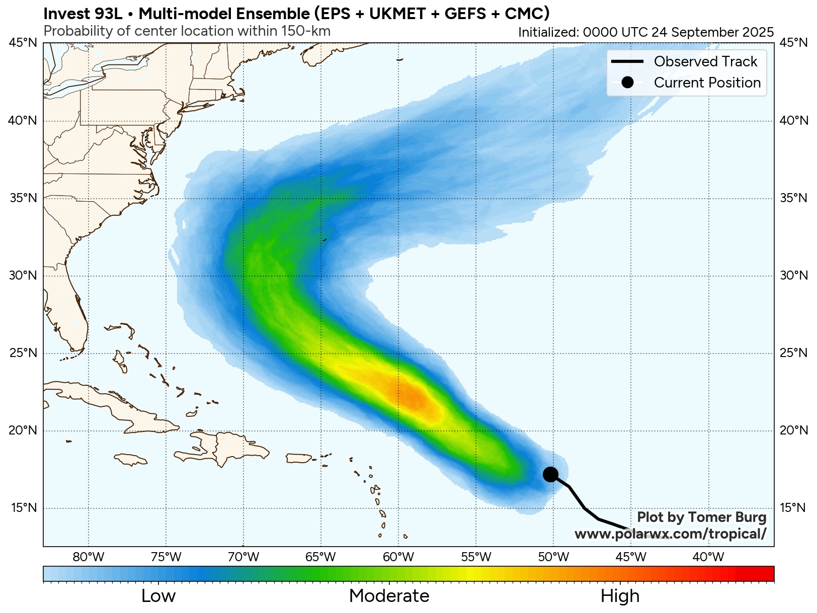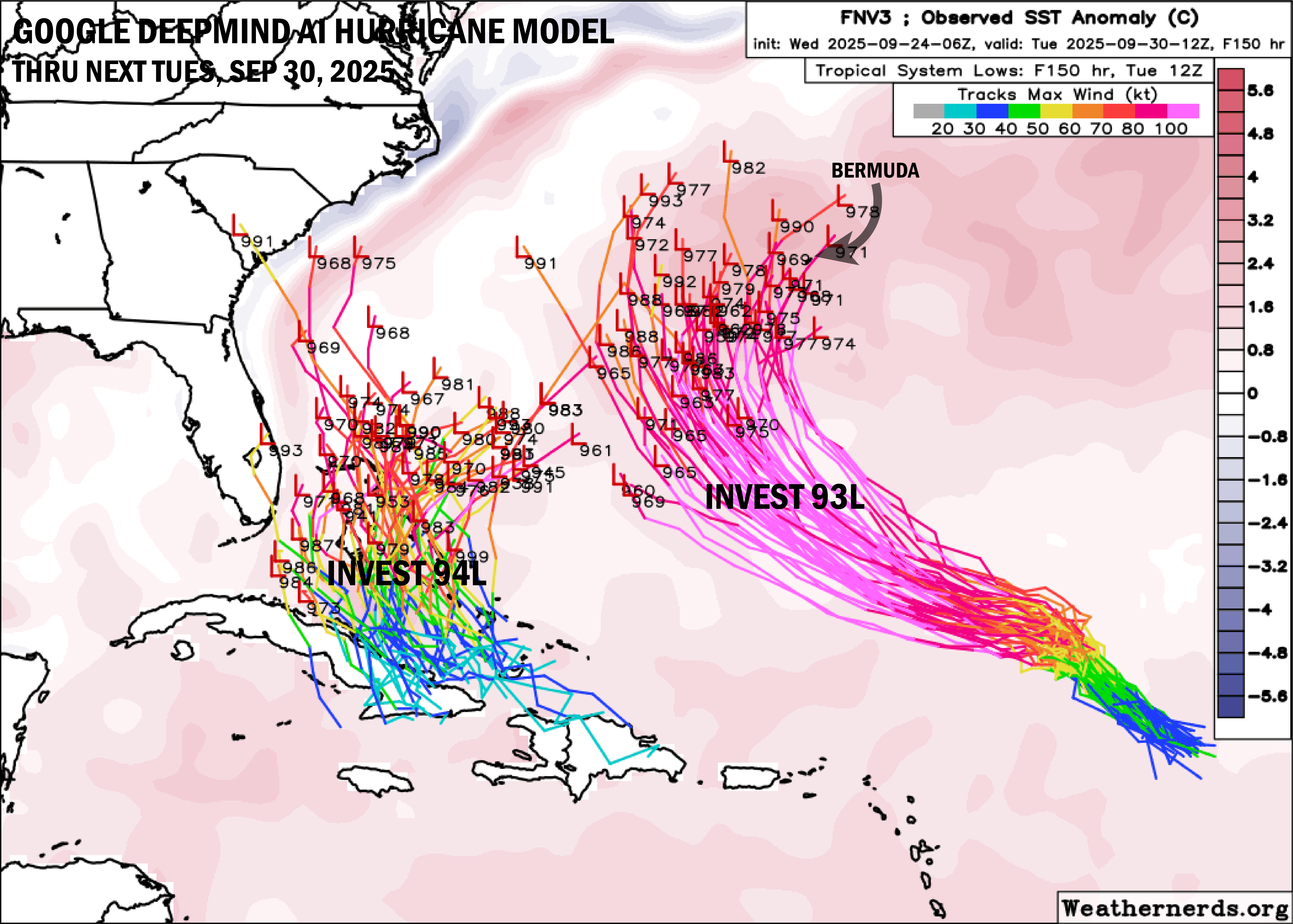 The American GFS keeps 94L – the westernmost system – weak, with 93L becoming a hurricane and gobbling up 94L’s circulation. Google’s DeepMind AI hurricane model is similar to the European solution, showing the possibility of two distinct hurricanes early next week.