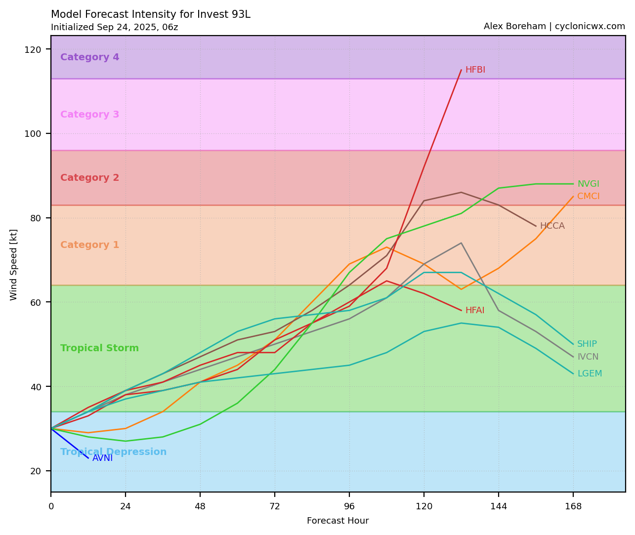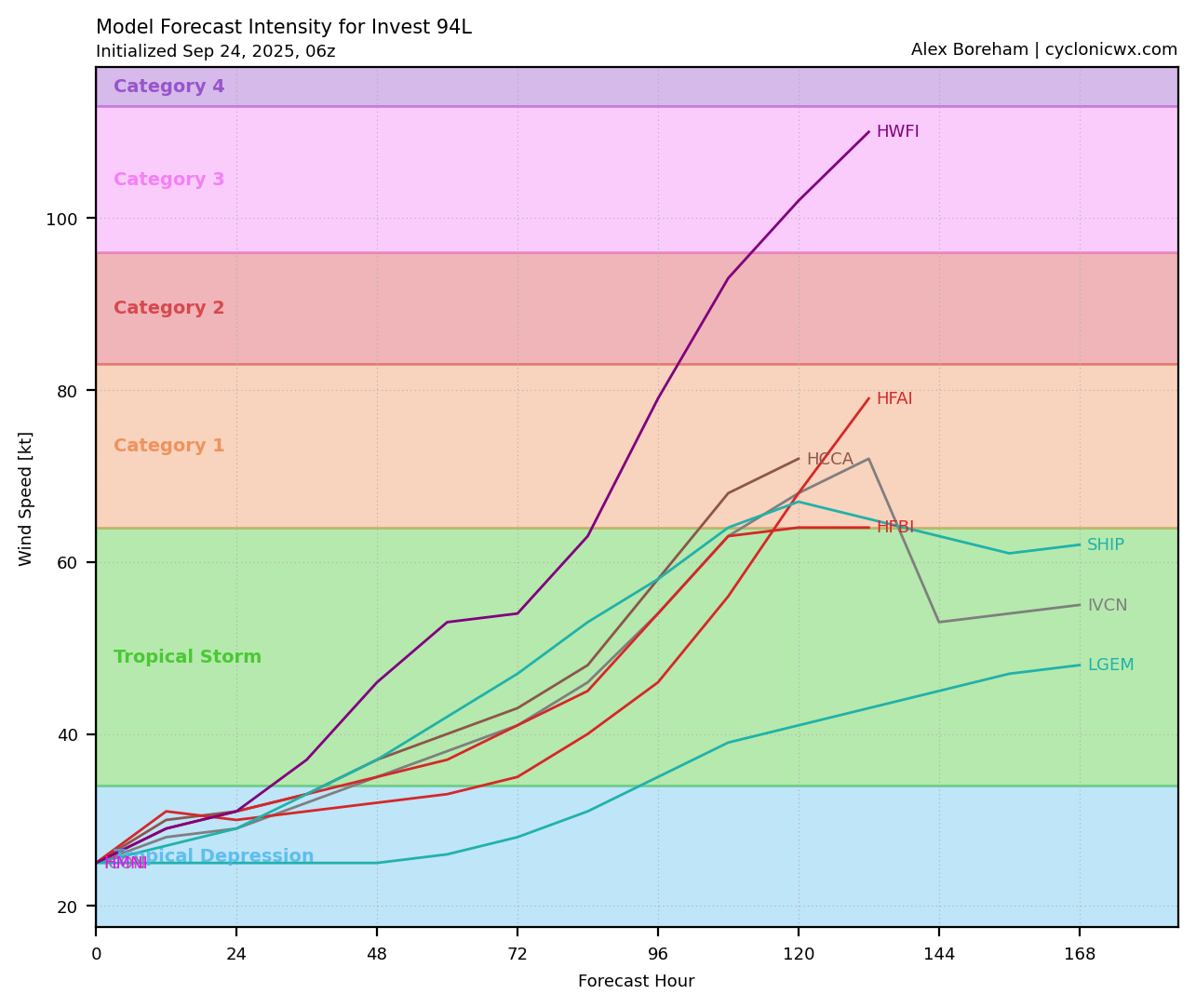 The dueling hurricane scenario is supported by our most reliable intensity aids, including the corrected consensus aids and our next-generation hurricane models like the Hurricane Analysis and Forecast System (HAFS or HFAI and HFBI below).