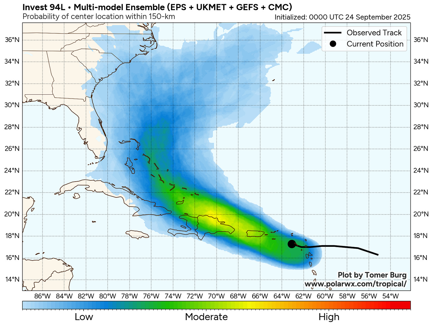 Meanwhile, the westernmost system (Invest 94L), about 700-800 miles to the west of 93L, remains disorganized as it passes through the northern islands of the Caribbean. Hostile wind shear is forecast to subside by Friday into the weekend as 94L nears the warm water of the Bahamas, however, which should allow it to organize.