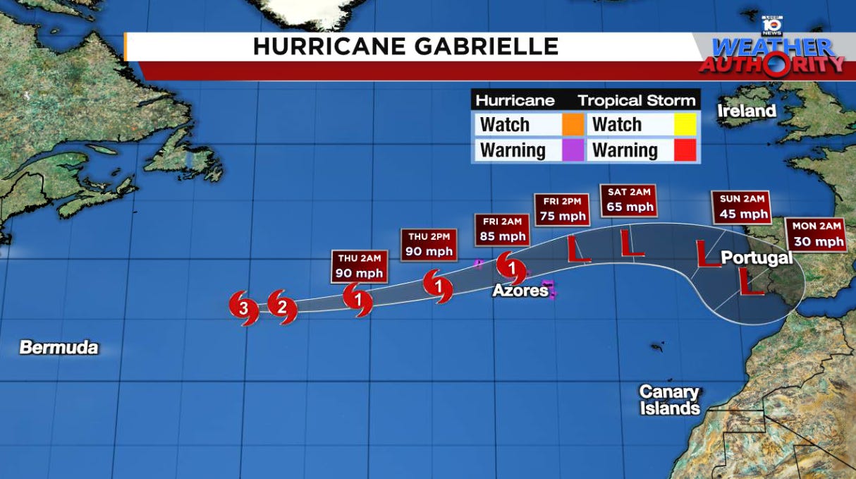 Although Gabrielle is weakening over the north Atlantic, its fast forward speed and interaction with the jet stream will give its winds a boost as it rips through the Azores late Thursday and Friday.