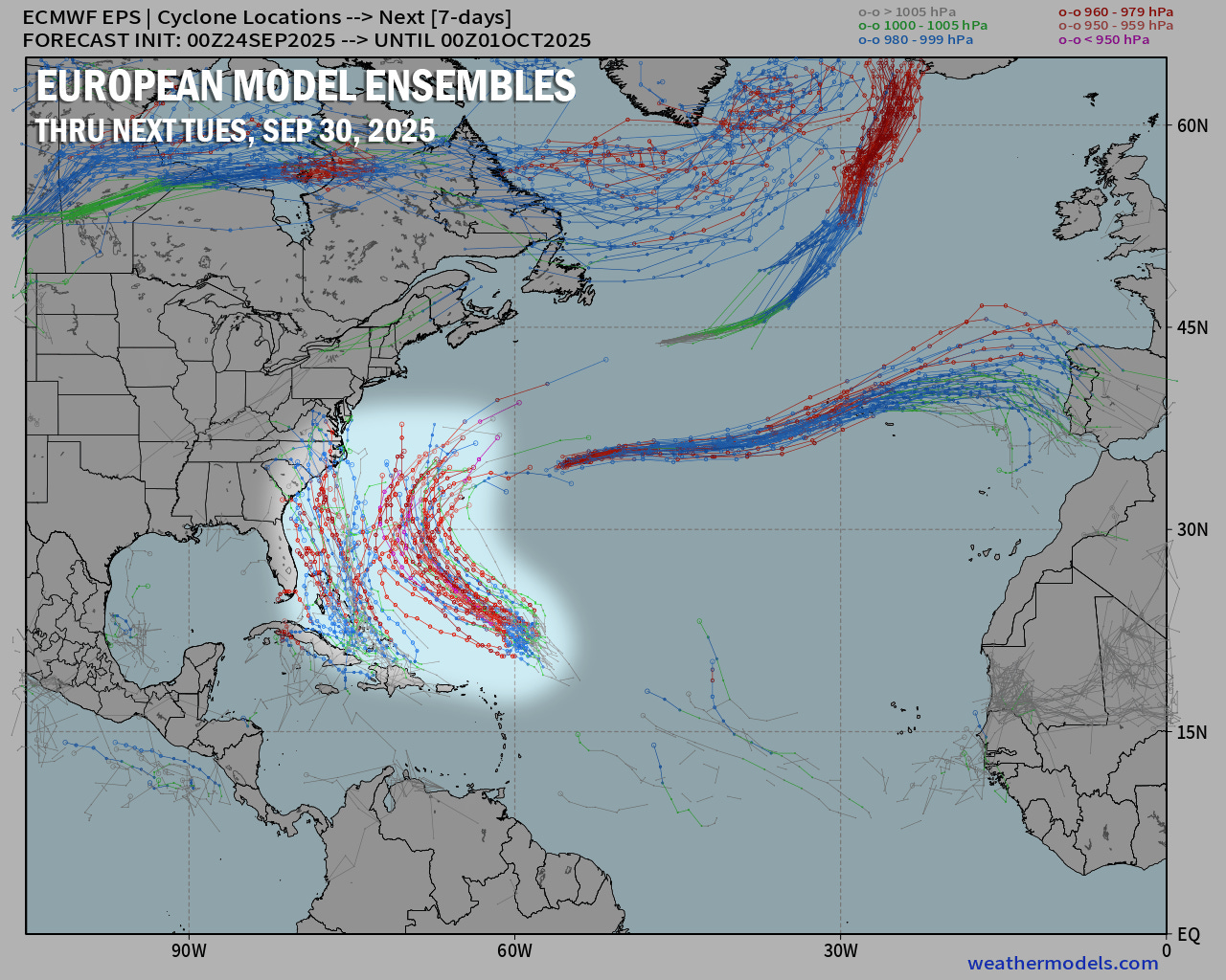 For now, most forecast models keep the two systems distinct entities into early next week, and a true Fujiwhara interaction remains an outlier scenario. Nevertheless, even a low possibility of a binary interaction complicates the outlook.