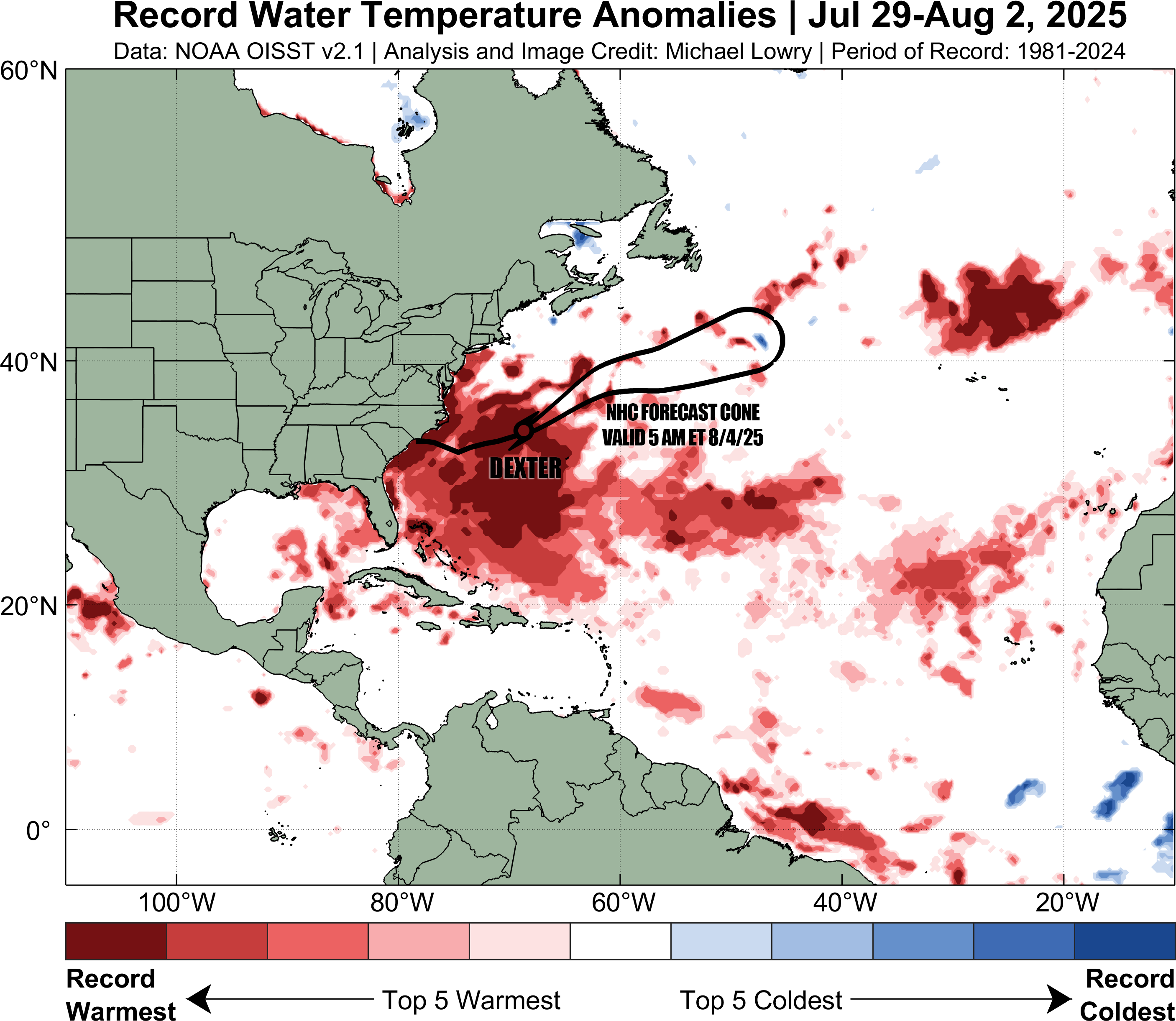 The frontal low off the Carolinas that we discussed in Friday morning’s newsletter, first mentioned by the National Hurricane Center in its outlook on Saturday, took advantage of conducive conditions, including record warm waters between the southeast U.S. and Bermuda, to outperform model expectations and become Tropical Storm Dexter late Sunday.
