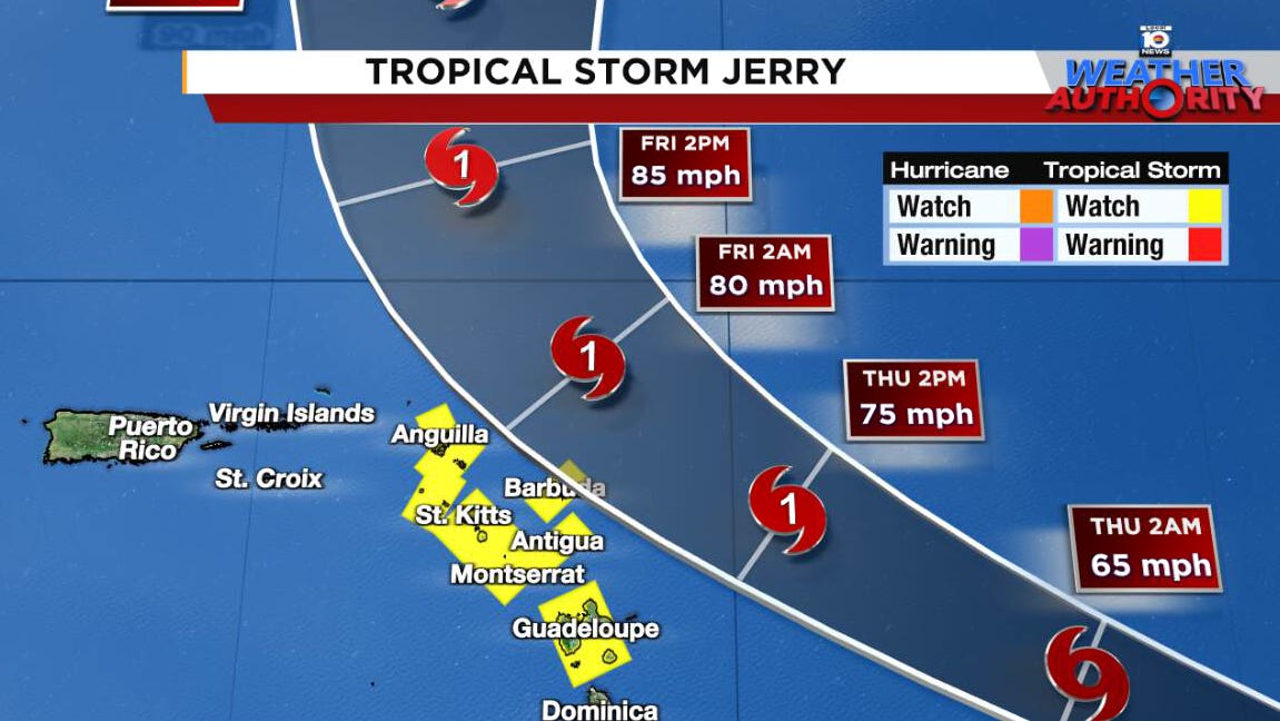 Jerry doesn’t pose a direct threat to Puerto Rico or the Virgin Islands, but a tail of trailing moisture as it pulls north Friday may increase rain chances for the weekend.