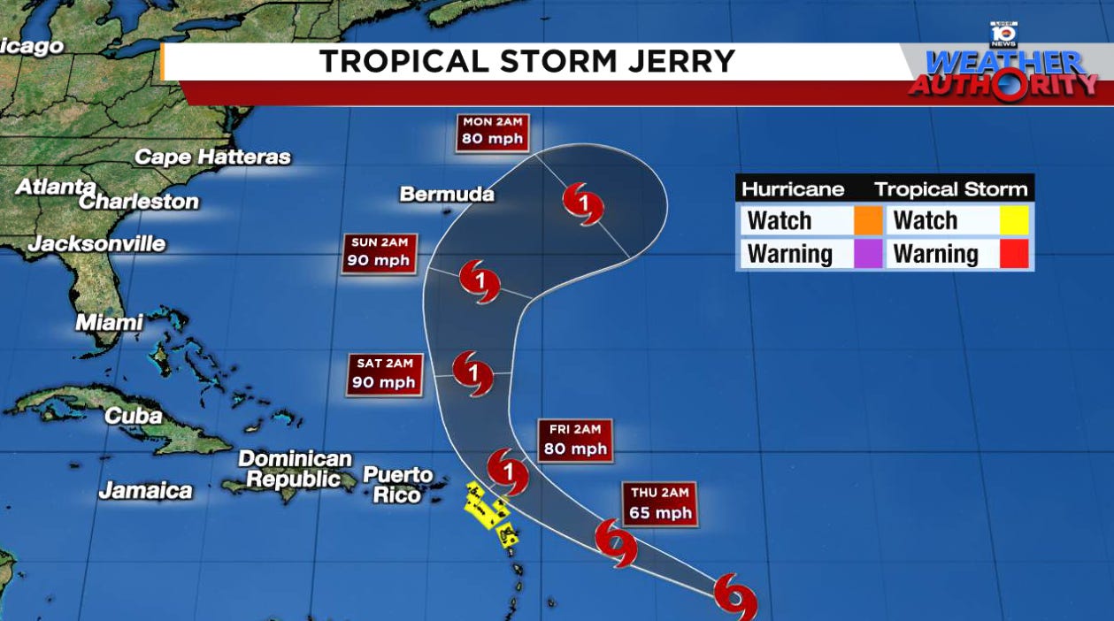 Jerry is expected to turn well east of Bermuda early next week and doesn’t pose a threat to the British Overseas Territory.