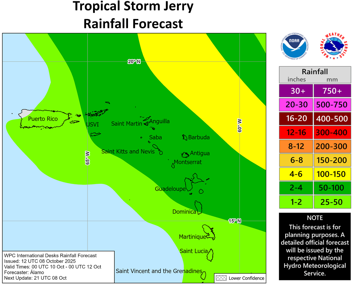 Although the official forecast keeps the center of Jerry about 100 miles northeast of the islands during its pass tomorrow and Friday, periphery effects, including gusty winds and squally rainbands that could pose a flash flood risk, will sweep through the Leeward Islands.