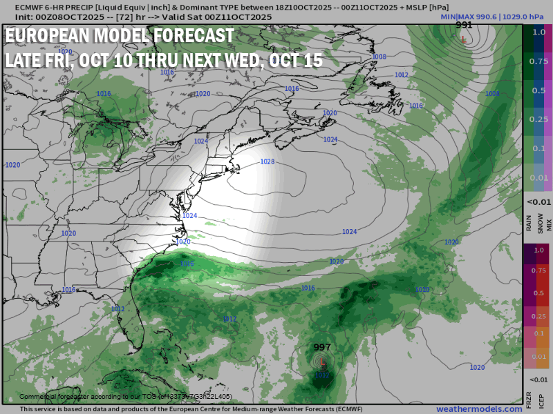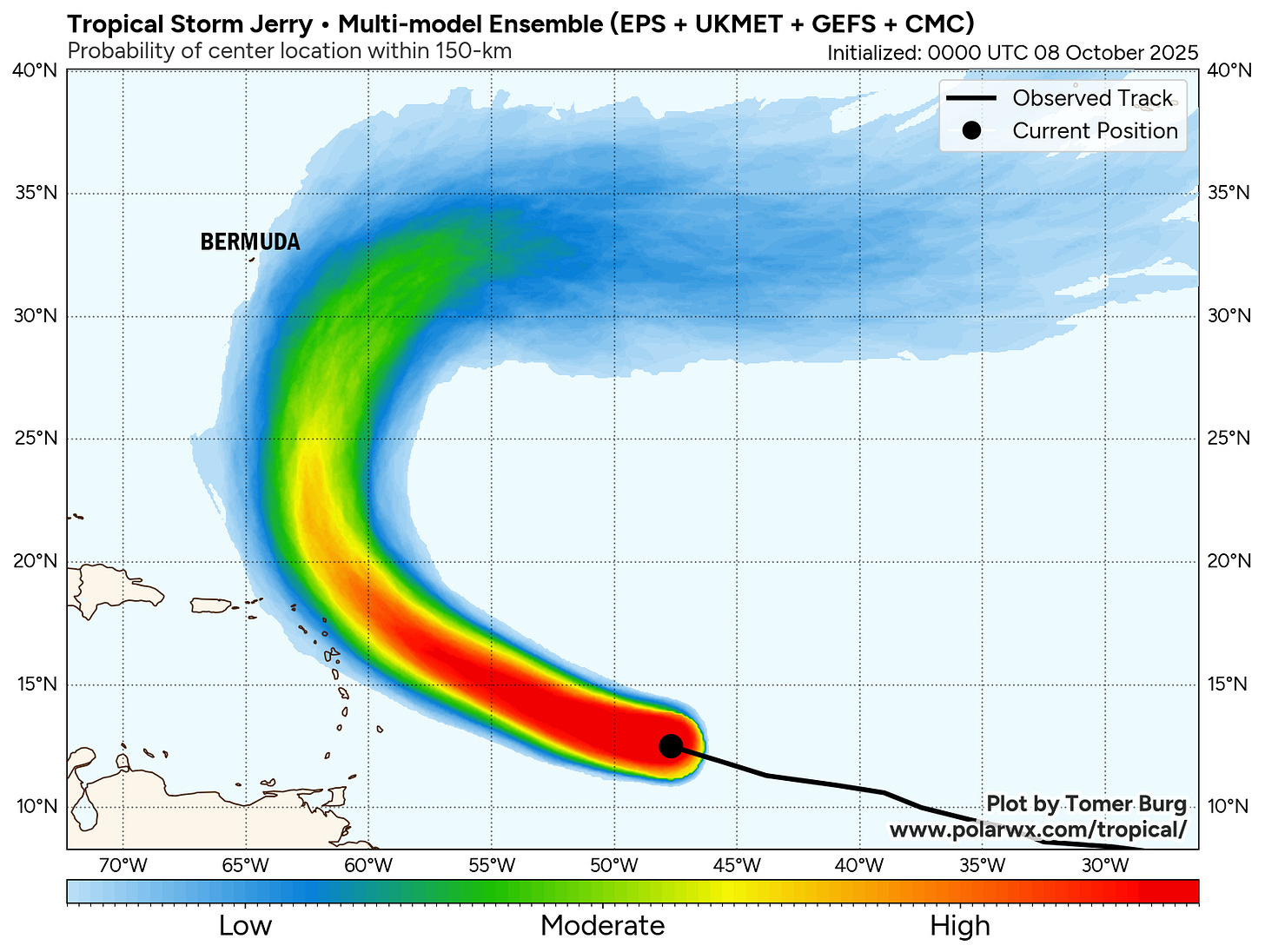 As we’ve discussed in earlier newsletters, a strong October cold front diving through the southeastern U.S. and into the western Atlantic this weekend will kick Jerry out to sea.