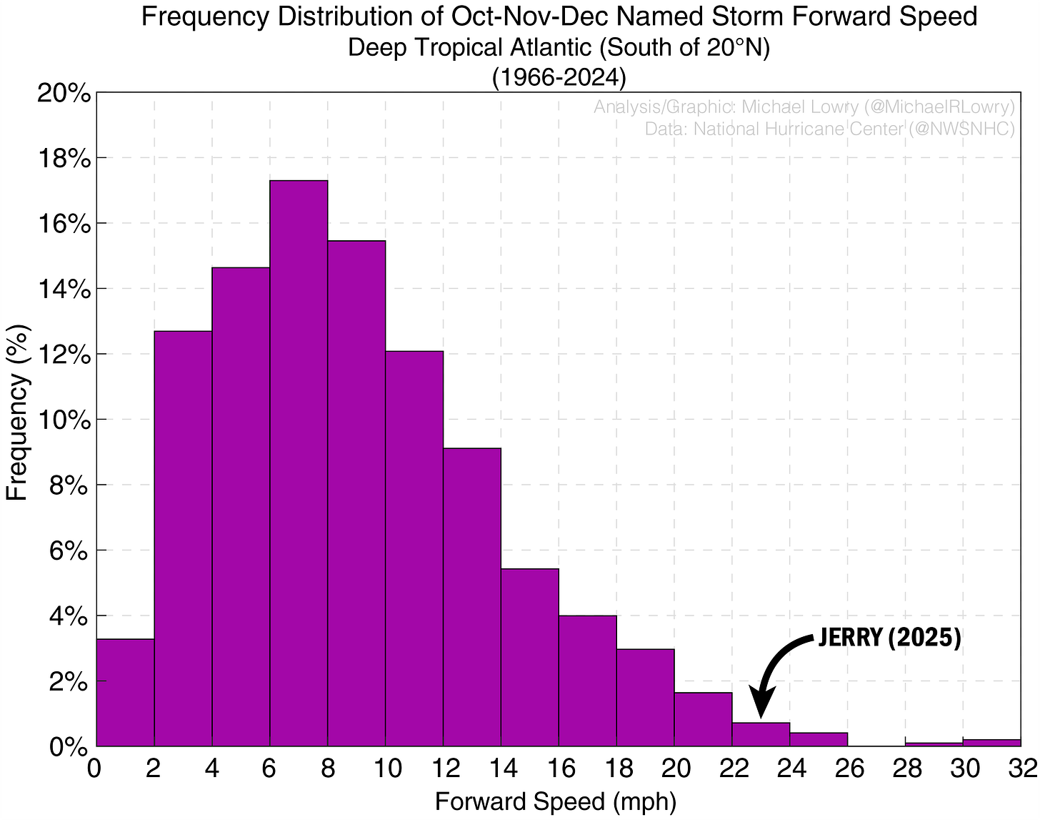Jerry’s been sailing along at 23 to 24 mph, an extremely fast motion for a tropical storm or hurricane in the deep tropics. In fact, since satellite records began (since 1966), only five named storms have moved as quickly as Jerry in the deep tropics this late in the season, putting Jerry’s forward motion in the top 1% for this part of the Atlantic.