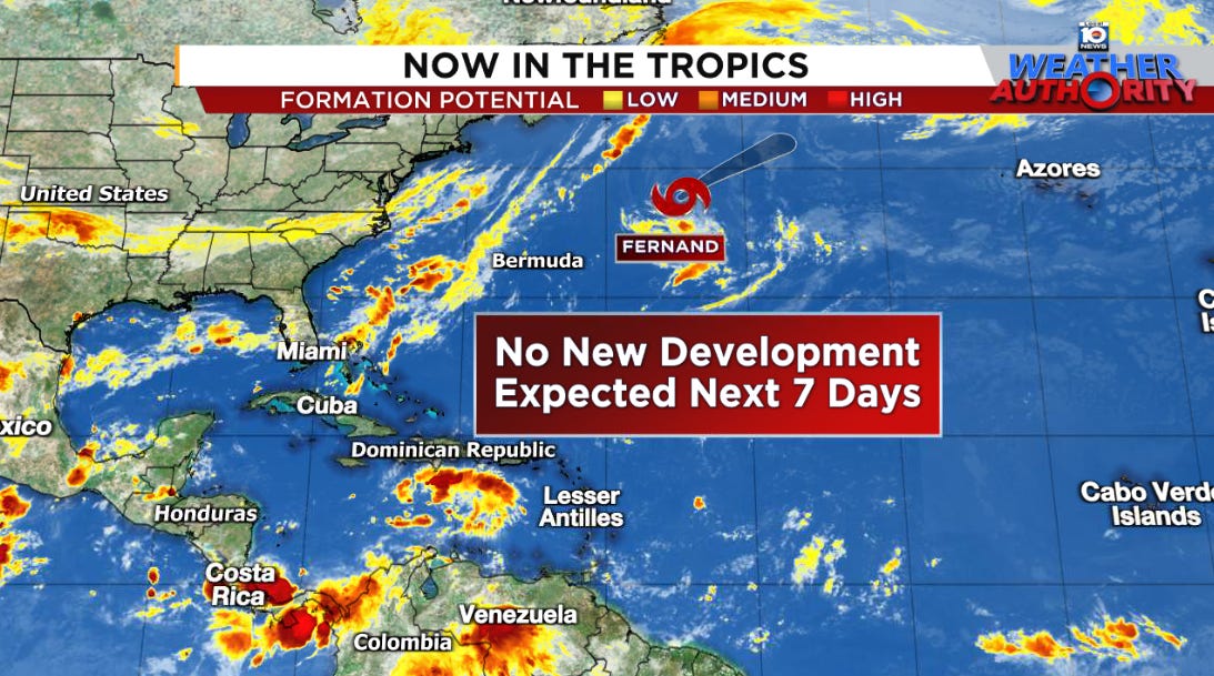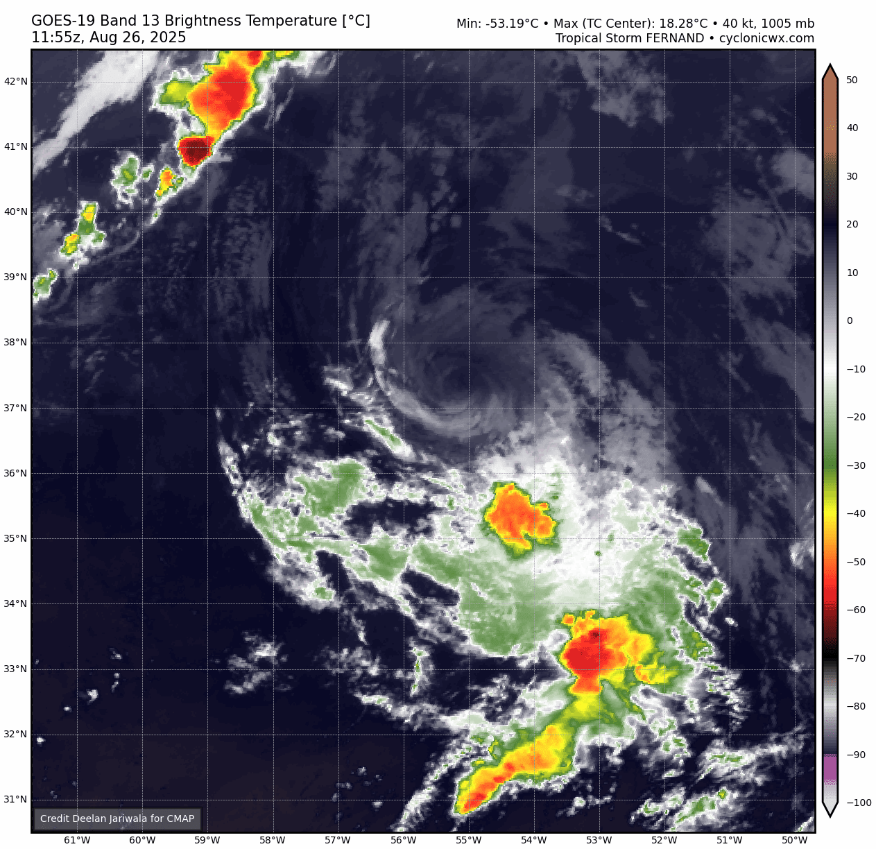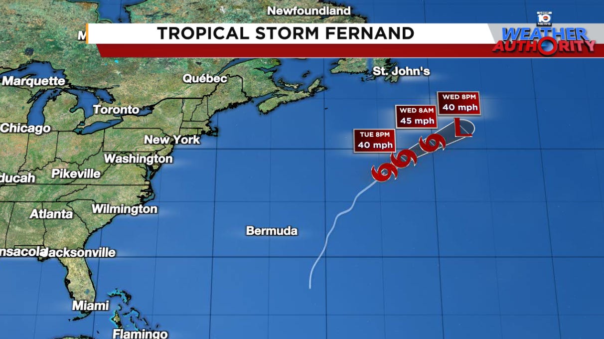 Though NHC does mention the possibility of some very brief restrengthening as it passes over a pocket of warm waters in the next 24 hours, Fernand is forecast to lose its tropical characteristics by late Wednesday.