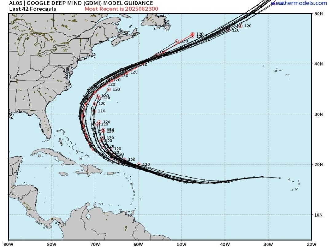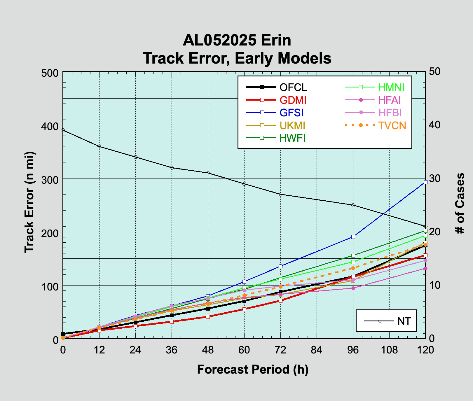 In verification data shared by former National Hurricane Center Branch Chief James Franklin on Monday, the Google DeepMind model had the best track and intensity forecasts for Erin for the first 3 days (72 hours) across all forecasts, and remained competitive with the best-performing track and intensity aids through five days across all forecasts.