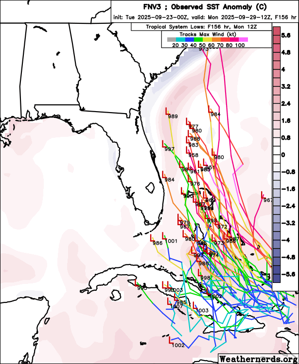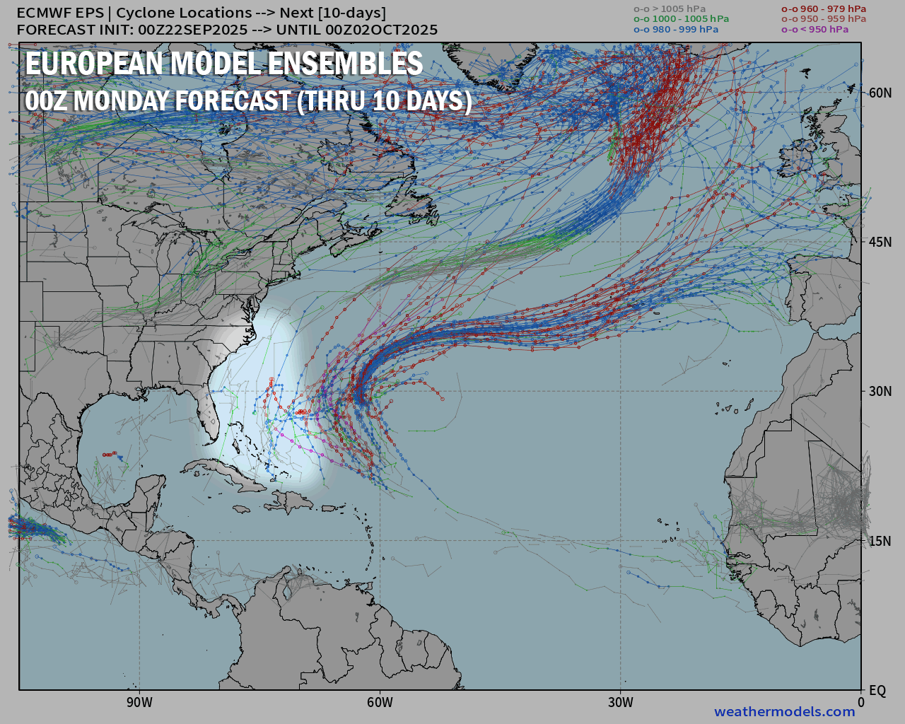 The most bullish model camp on development is Google’s DeepMind AI-based hurricane model – a strong new performer so far this season – which turns the system sharply north near the Bahamas this weekend into early next week. Many scenarios from the DeepMind hurricane model are stronger, so we’ll need to monitor these trends closely.