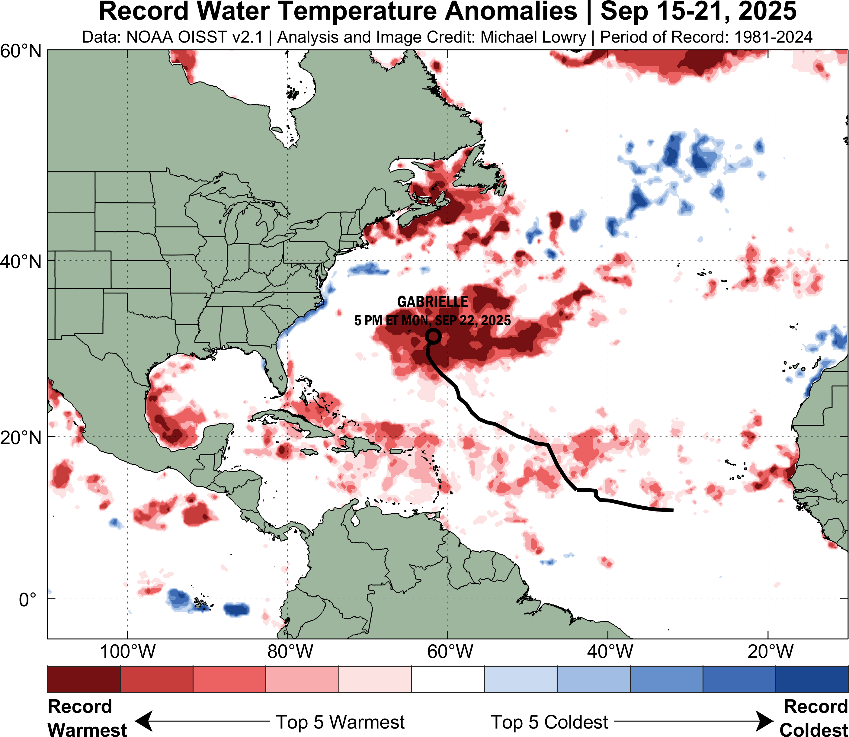 Gabrielle’s rapid strengthening on Monday – a 60 mph increase in its maximum winds from only 24 hours earlier – coincided with its passage over record warm waters for the time of year, supported by increasingly conducive upper-level winds.