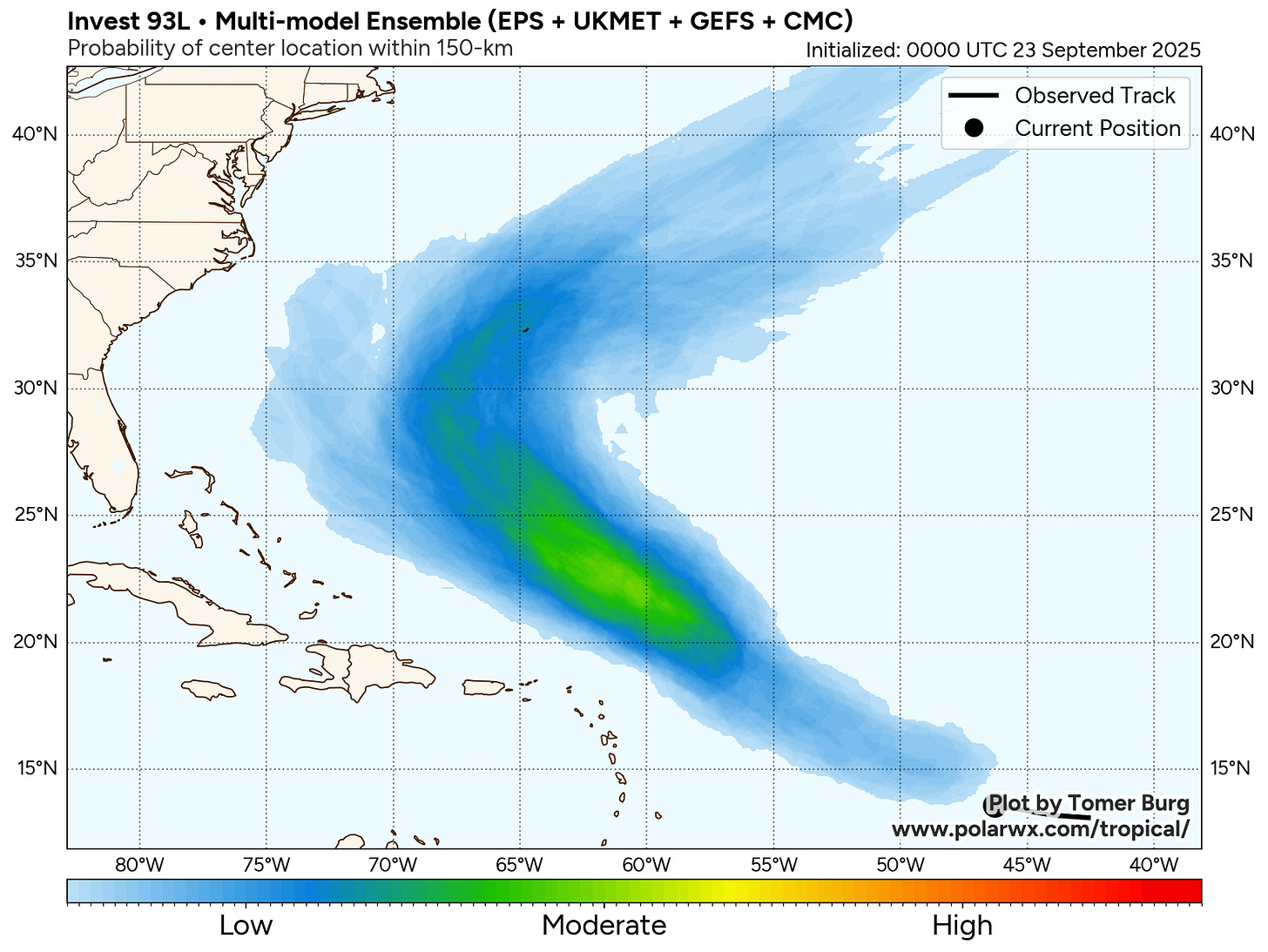 Most of our guidance is bullish on strengthening 93L into a hurricane next week but keeping it safely east of the U.S. This one is looking like it’ll make a close pass to Bermuda, but west of where Gabrielle tracked, as a powerful hurricane from next Monday to Wednesday (September 29-October 1).