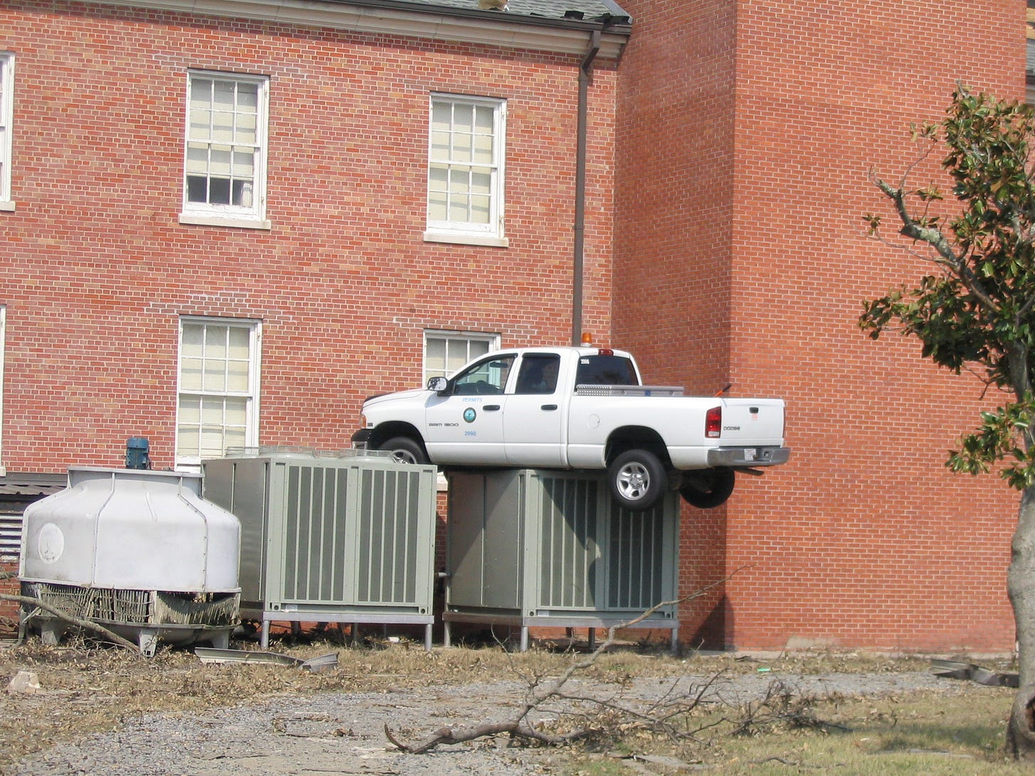 Cars, trucks, and vans looked like they’d fallen from the sky. I saw cars on the roofs of houses, cars balancing on the tops of fences, cars stacked on top of other cars piled on top of industrial air conditioning units.