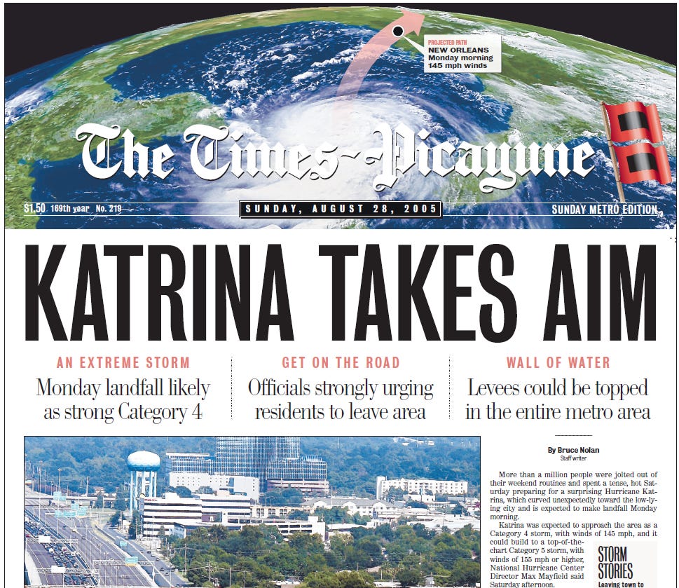 Roadside newspaper stands were converted into time capsules. “KATRINA TAKES AIM” read the front page of the New Orleans Time Picayune, dated August 28th, 2005, the day before Katrina struck. An avid collector of historic newspapers and magazines, I recovered one of these papers after the floodwaters receded and keep it in a frame on a wall in my office as a daily reminder that a hurricane forecast is a process, not an outcome.